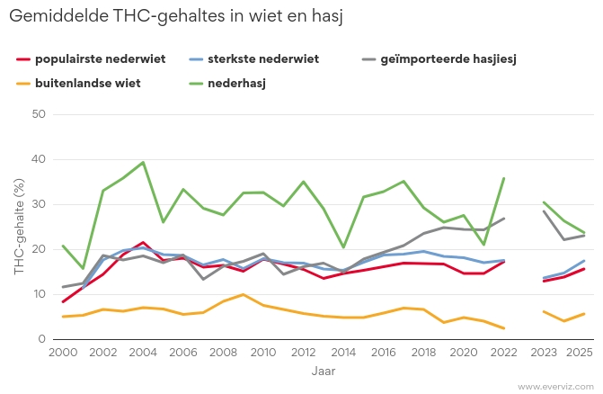 Het gemiddelde THC-gehalte van nederwiet in Nederlandse coffeeshops is in 2025 gestegen ten opzichte van 2024. Dat blijkt uit de 26ste THC-monitor van het Trimbos-instituut, uitgevoerd in opdracht van het ministerie van Volksgezondheid, Welzijn en Sport. De meest verkochte nederwiet bevatte gemiddeld 15,6% THC (vorig jaar 13,8%), terwijl de sterkste varianten uitkwamen op 17,4% (vorig jaar 14,7%).